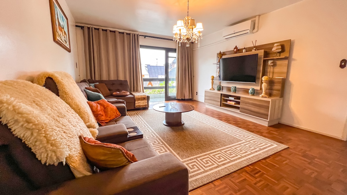 Ap novo, no centro, com 2 suites + colchão auxiliar e lavado, 94m privativos, de frente com sacada, vista serra e centro, 180m da rua coberta e 50m do complexo vita (nova rua coberta). Restaurantes, lojas, farmácias, td o que o centro de gramado oferece a 50m do ap. Calefação em td ap, split na sala e nas 2 suítes (só frio), churrasqueira, cozinha equipada, maq de lavar roupa, finamente mobiliado. Garagem coberta para 1 carro. Disponibilizamos roupa de cama, cobertores e toalhas, pronto p o uso.