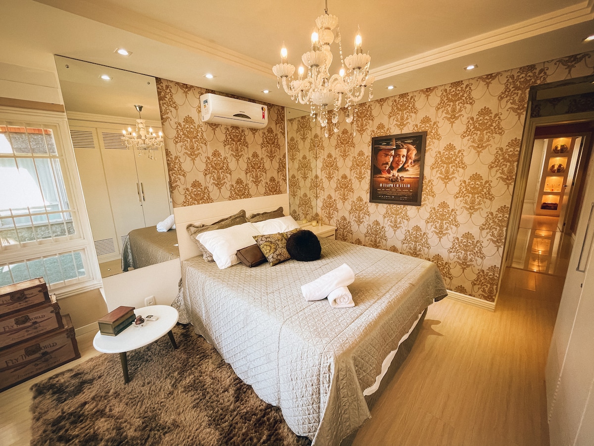 Sofisticação e aconchego no coração de Gramado! WIFI EXCELENTE! Ap muito amplo, confortável, bem equipado! Decoração excepcional dedicada ao cinema brasileiro. NOVO, 200m da Rua coberta e palácio dos festivais, lojas e restaurantes. Supermercado a uma quadra! 3 quartos (camas queen), sendo 1 suíte, 1 banheiro e 1 lavabo. Roupa de cama, cobertores e toalhas. Duas vagas de garagem. Cozinha completa. Chuveiro à gás. Ar-condicionado nos quartos e sala (quente e frio). Wi-fi. Churrasqueira.