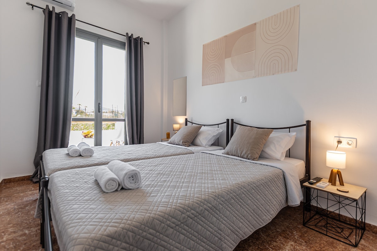 A brand new quiet and cool apartment in a beautiful relaxing yard in the heart of Naxos town is the best choice for your vacation. A short walk from the port, the commercial center of the town and the nearest beach. Nearby there are supermarkets, gyms, bus station, taxi rank, cafe, bars and restaurants