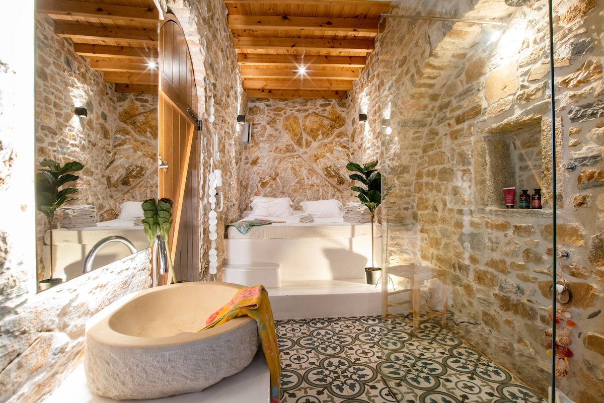 “Thermes” (the Baths) of the mansion. An independent block from the rest of the historic towerhouse. A spot of relaxation and redemption from physical pain. Thermes (The Baths) were an indication of fiscal power for the families of those days Today the residence has been transformed, with full respect to its past style and use, into a modern Spa-Suite, filled with romance. In the comfortable outdoor area, the plentiful natural materials of the island (stone & marble) do dominate the surroundings