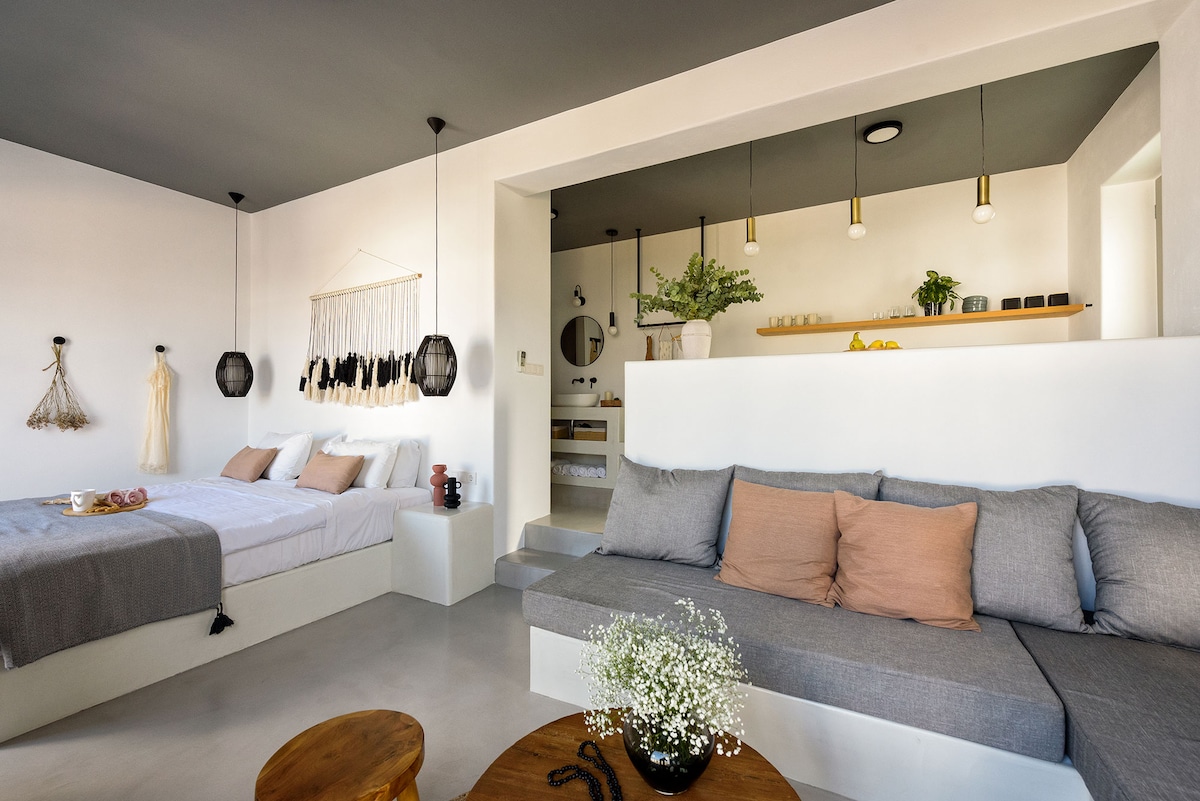 An ideally located 30sqm studio with a unique romantic sunset view, less than 1 km away from the main town of Parikia. A spacious veranda with a marble dining table, a comfy bedroom with a bathroom and a fully equipped kitchen. The studio is only 10 minutes walk from the old market street, and a few minutes drive from the famous beaches of Paroikia.
