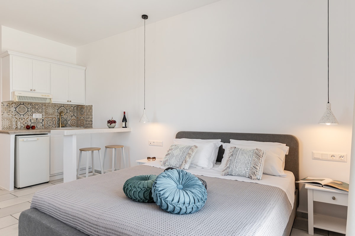 Welcome to our charming small cycladic hotel in Naxos, Greece. Nestled in the beach of Agios Prokopios, our intimate hotel boasts six uniquely designed rooms, each offering a tranquil and cozy retreat for our guests. Alas cycladic suites is only 25 meters from the best beach of the island, 5km from Naxos town and 2,5 km from the airport. Just two steps away is everything that you may need from beach bars, restaurants to shops and supermarkets. Also the bus station and taxi rank is a minute away.