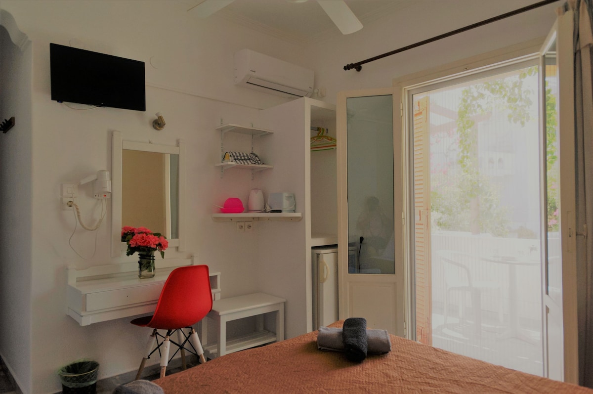 A very romantic room with magnificent sea view all over Piso livadi , the Aegean sea and the traditional pier . There is daily cleaning and after 2 days stay e change towels and every third day the sheets . We are always around in order to offer you a nice and pleasant stay in our place !!!
