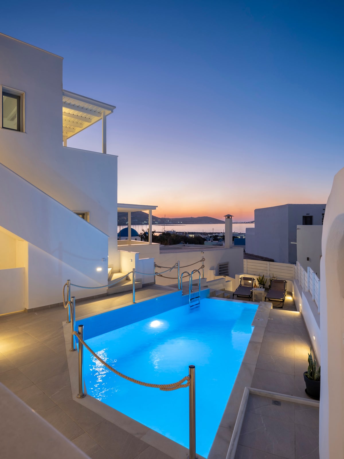 Elegant Private Villa with Pool in the Heart of Aliki – Walk to Beach & Restaurants This beautifully designed private villa offers the perfect blend of Cycladic charm and modern comfort. Located just a 5-minute walk from the lively village center, sandy beaches, and authentic tavernas, the villa is ideal for guests seeking both convenience and tranquility.
