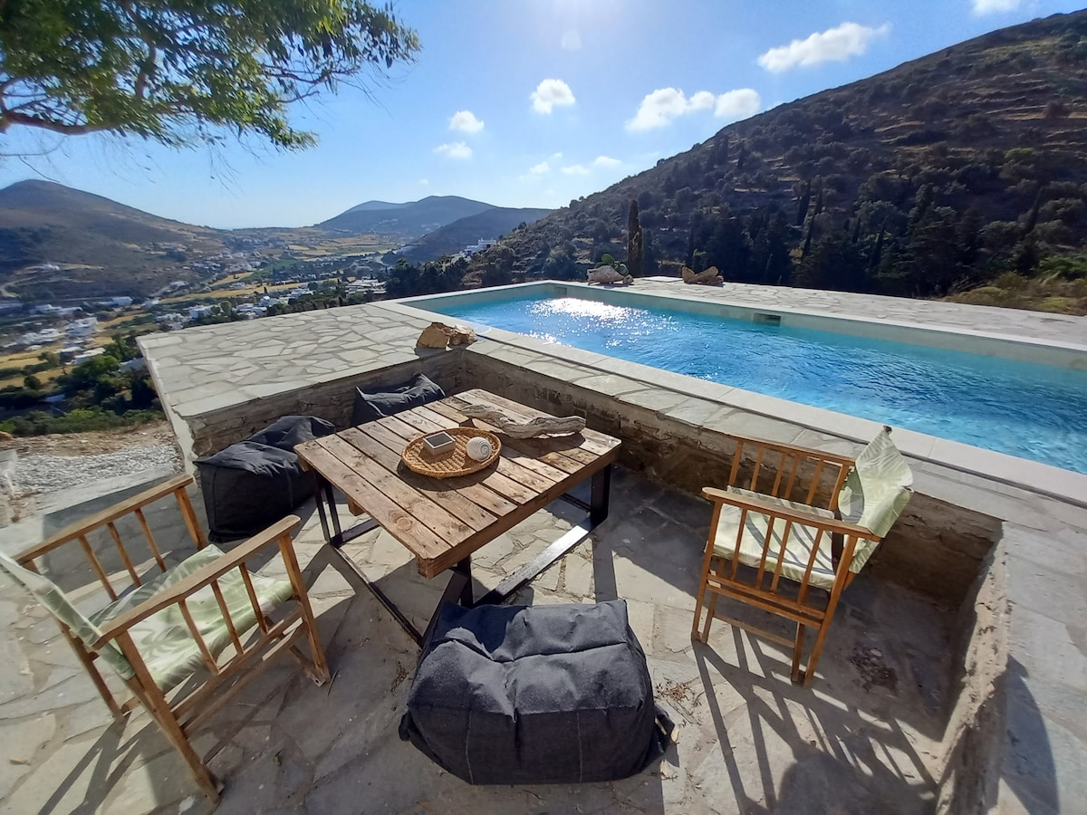 One of the two brand new Eneos Villas at the hilltop over the port town – for sweetlifers only! Fully air-conditioned of course, with 3 bedrooms, 2 bathrooms and 1 WC, a (7x3) pool, and stunning sea views. Ideal for demanding digital nomads :) Freshness, brightness, happiness. Enjoy relaxation, stay far from the noisy streets of the island, and indulge in the villa you truly deserve! Daily cleaning is included in the price, so you can fully unwind and focus on enjoying your stay. Enjoy !!