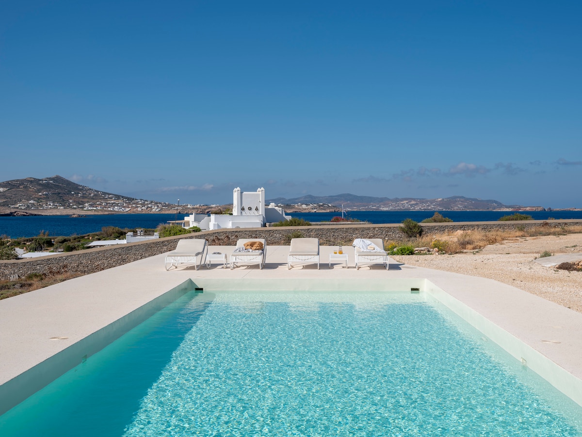 Villa Arismari is located on a serene hillside, surrounded by natural boulders, overlooking the beautiful coast of Orkos. We have a breathtaking panoramic view of the Aegean Sea and our neighboring island of Paros. We are situated between the main beach and smaller bays of Orkos. While enjoying the view that Villa Arismari offers prepare to take your most incredible selfies . Villa Arismari is a beautifully designed villa of Cycladic minimal architecture.