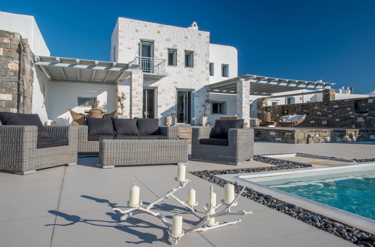 Nisides Villa Naoussa is located 600 m away from the center of Naoussa, the most famous place of Paros. Despite the fact that our villa is very close to Naoussa it has the necesary privacy and it is in a very quiet position. The private swimming pool between our bedrooms and living room, gives more privacy to our guests. New-built property provide all the conveniences as it has a fully equipped open plan kitchen, a spacious living and dining area and 5 bedrooms with private bathrooms.