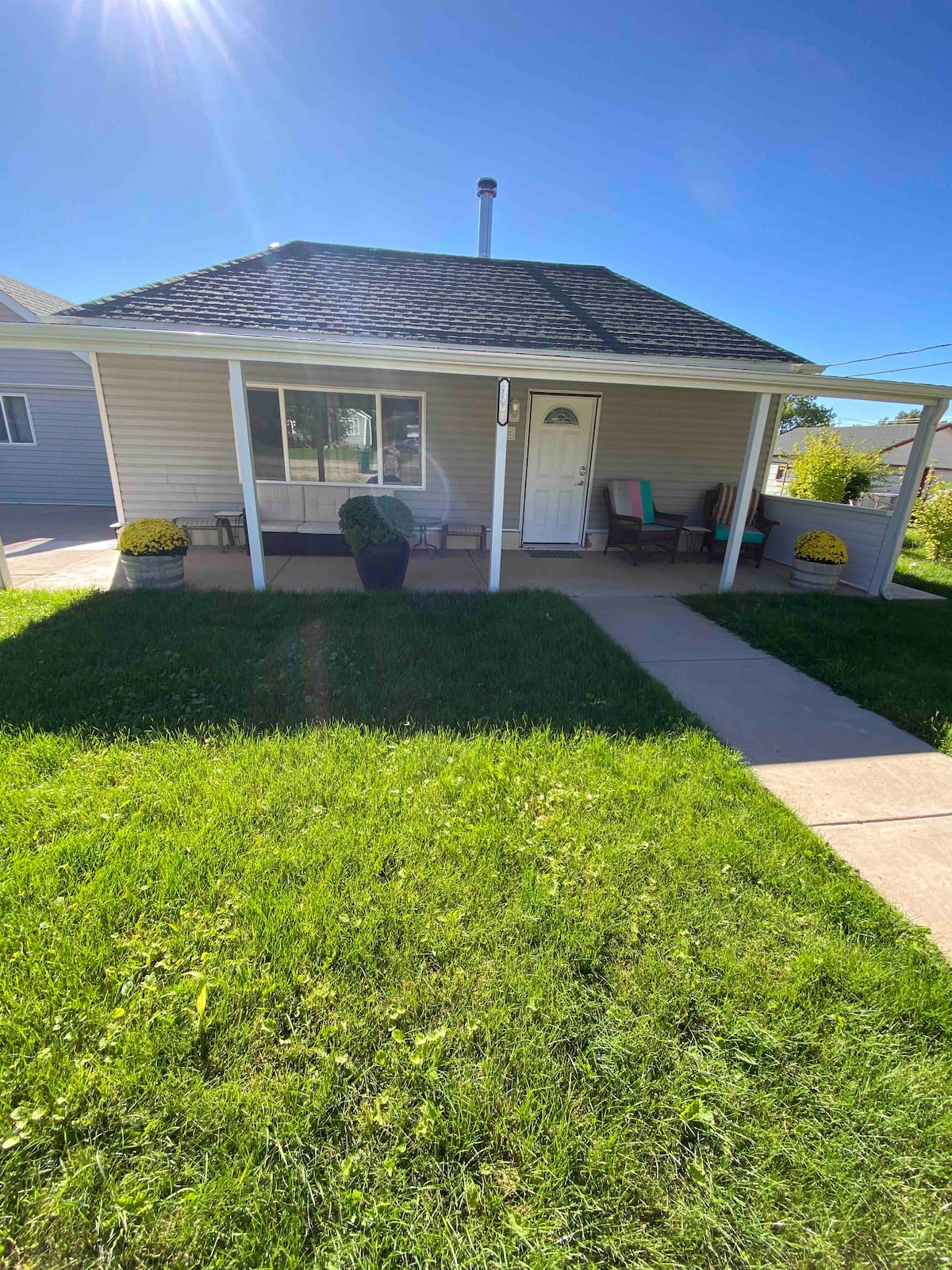 Float to sleep on a uniquely handcrafted hanging bed which is the highlight of this beautifully decorated upper floor studio apartment. It is very secure and the gentle swing of the bed can easily be stopped if you don’t like motion. With a soda shop only steps away, it makes this stay extra “sweet!” The newly constructed suite is in the upstairs of a warehouse, with fantastic views of farm fields. This fresh, vibrant place is just a short drive to many national parks and festivals! Come enjoy!