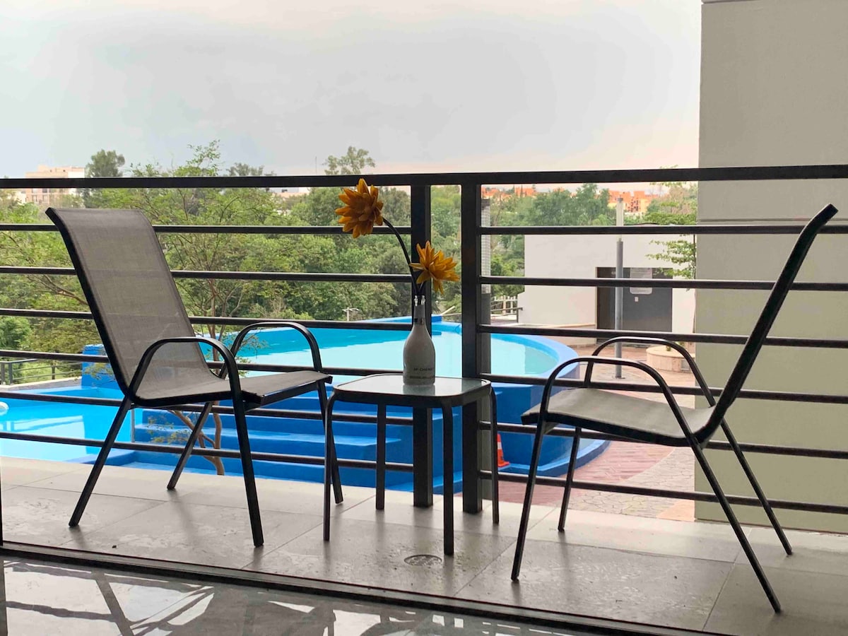 Departamento en un complejo moderno incluye alberca, gimnasio y zona común. La ubicación es excelente ya que se encuentra a tan solo unos minutos caminando del centro de la ciudad. Se localiza exactamente enfrente del Parque Alcalde, por lo que ofrece agradables vistas y actividades. Es una gran opción para viajes de turismo y negocios, Incluye 2 estacionamientos. muy seguro con seguridad 24/7 y reglamento interno que garantiza tranquilidad y seguridad Capacidad 6 personas