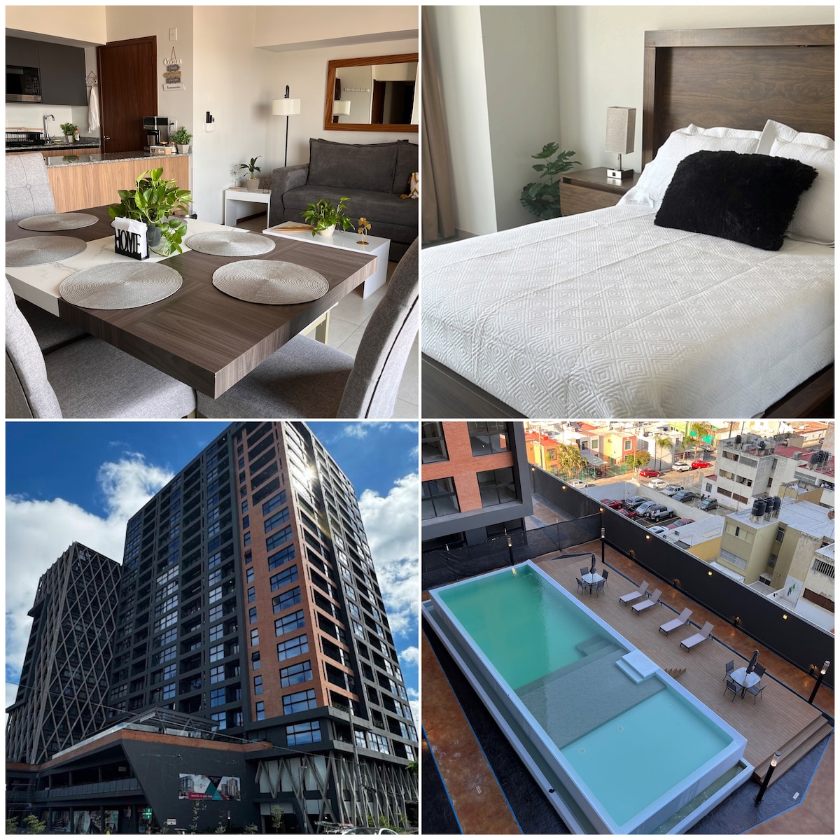 Departamento acogedor, limpio, céntrico y con vista espectacular a la ciudad. A/A en sala y recámara principal. Alberca de entretenimiento (su funcionamiento está sujeto a limpieza o reparación sin previo aviso, pofavor consúltame disponibilidad ) gimnasio y área infantil. Lobby de recepción. Seguridad y estacionamiento. Cerca de Paseo Alcalde y del tren ligero. Estaremos encantados de recibirte y compartir este espacio preparado para el descanso de los huéspedes.