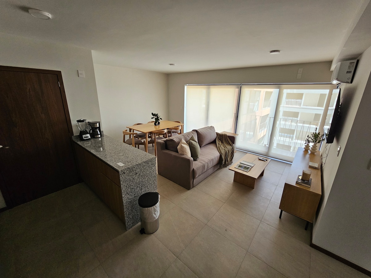Enjoy the convenience of staying close to the historical center (5-10 min car drive) at Guadalajara's new complex "Acervo Central Living". Apartment with excelelent location to shorten the journeys to the most important points of interest. Use the amenities: roof garden, coworking, central patio, lobby, kids zone, underground parking for 1 car and bikes, elevator. Discounts for weekly and monthly stays available.