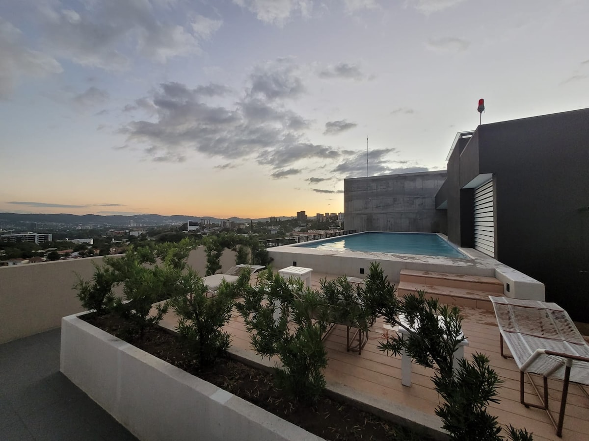 Apartamento nuevo, totalmente equipado y amueblado con una sola cama matrimonial, con decoración moderna pensado en garantizarte una cómoda y agradable estadía. Ideal para relajarte, disfruta de tu café por la mañana en la terraza con una gran vista a la ciudad o disfruta una copa de vino en la noche con la excelente vista a San Salvador. En una zona céntrica, estratégica y segura, cerca de supermercados, centros comerciales. A solo 40 minutos del Aeropuerto,