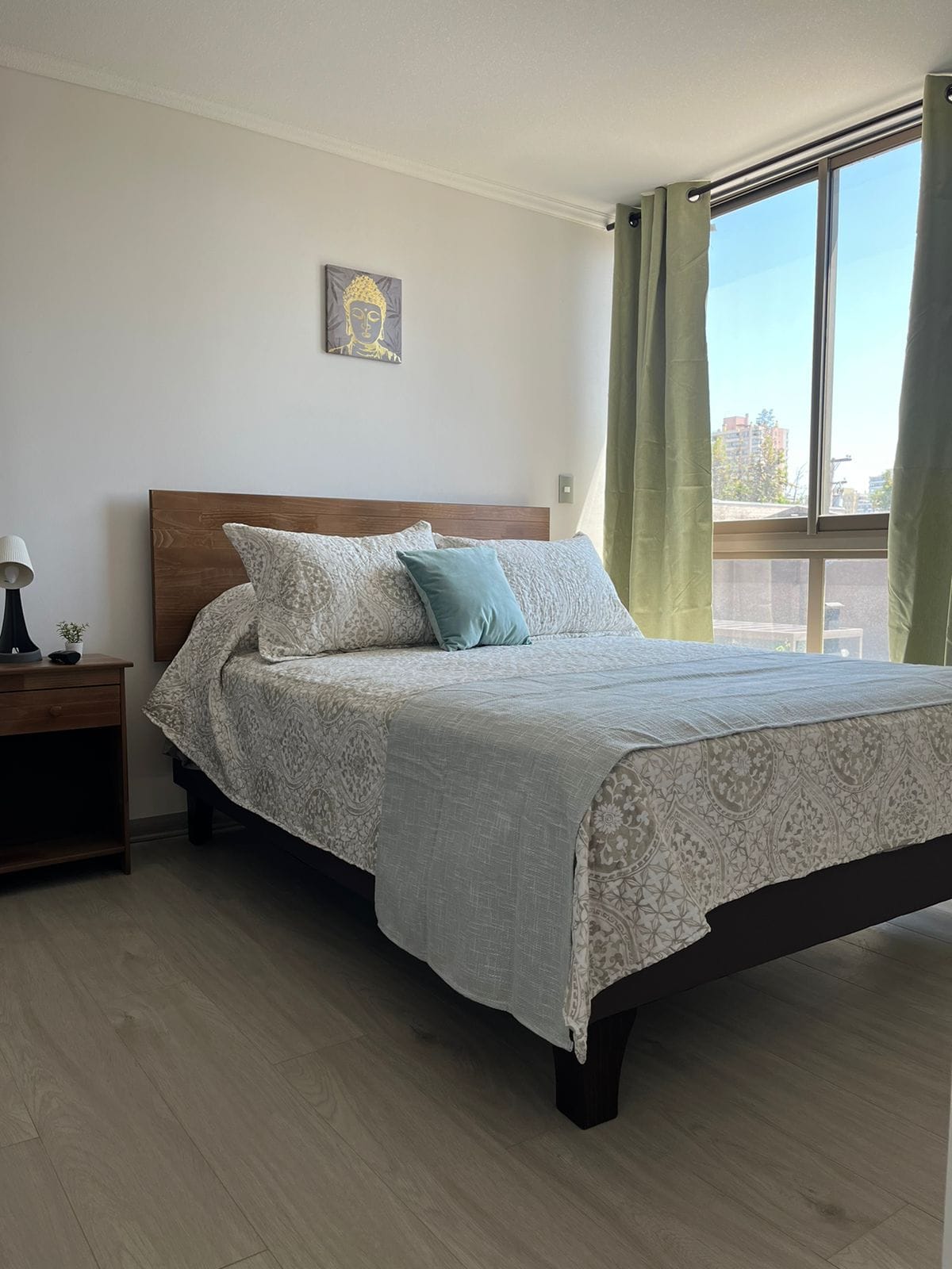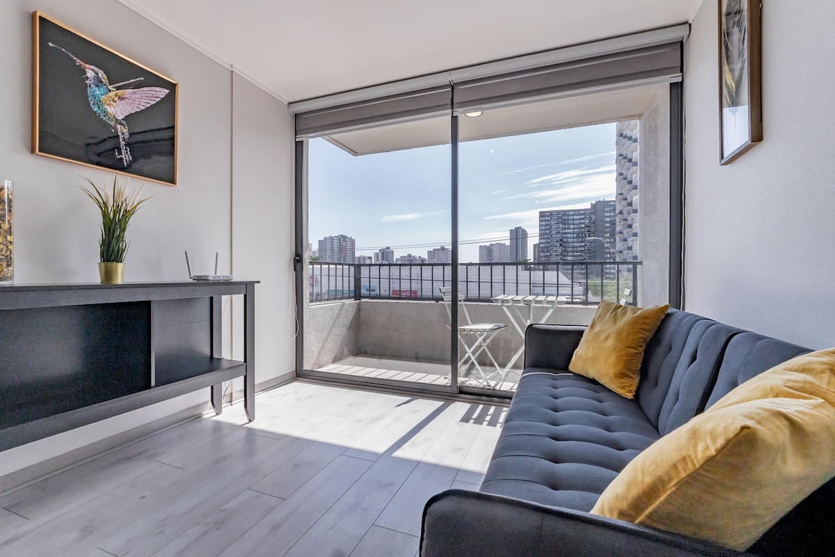 Acogedor y luminoso departamento con balcón, equipado con cama queen y un futón para un tercer huésped. Cocina Full Equipada Wi‑Fi 500 Mbps Smart TV Guarda‑equipaje gratis Pet‑friendly A solo 3 min del Metro Departamental, supermercados, restaurantes y cafés a pasos. Autopista Central a solo 5 min. Disfruta de gimnasio, quinchos y lavandería autoservicio en un edificio residencial seguro con conserjería 24/7. Ideal para parejas y estadías largas. ¡Reserva y vive Santiago como en casa!