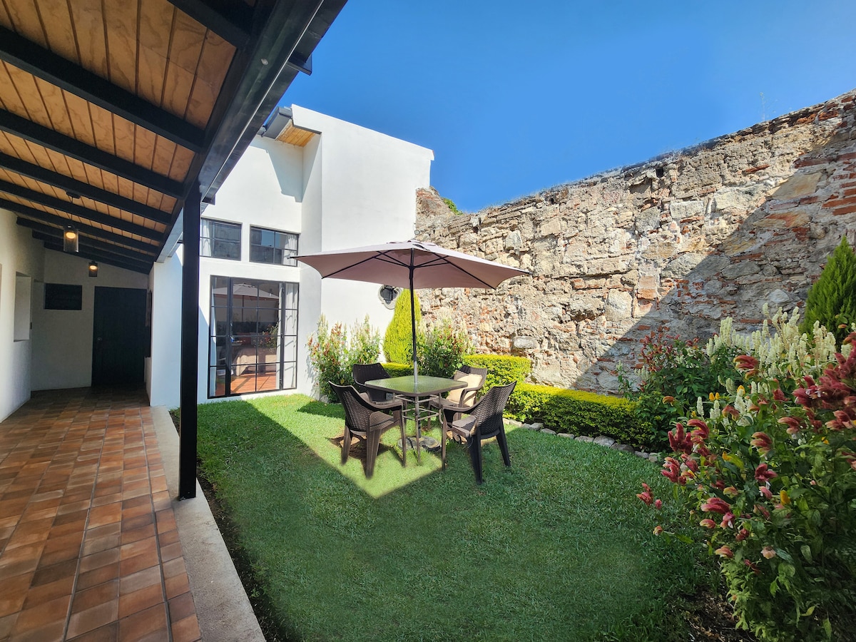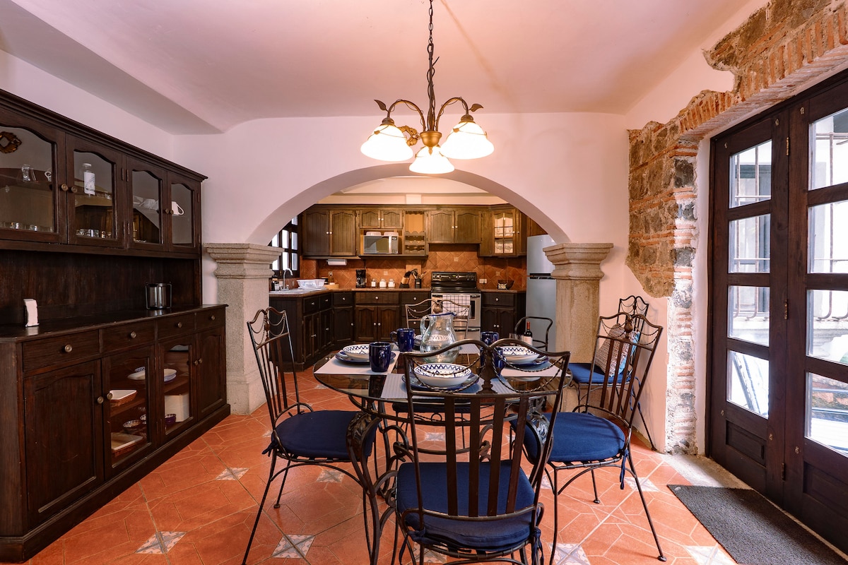 Enjoy Antigua in our house, Casa del Centro. A cozy place just 60mts from central park (1/2 block) the best in town. You can take the meals or the sun at the garden and enjoy the different lovely areas at the house. The house has a lobby, 2 rooms with queen beds. The principal room has a mezanine with a working area. Complete Kitchen, dinning and living room, laundry. The parking is free but it is located at 5 blocks. Wifi 80megas.