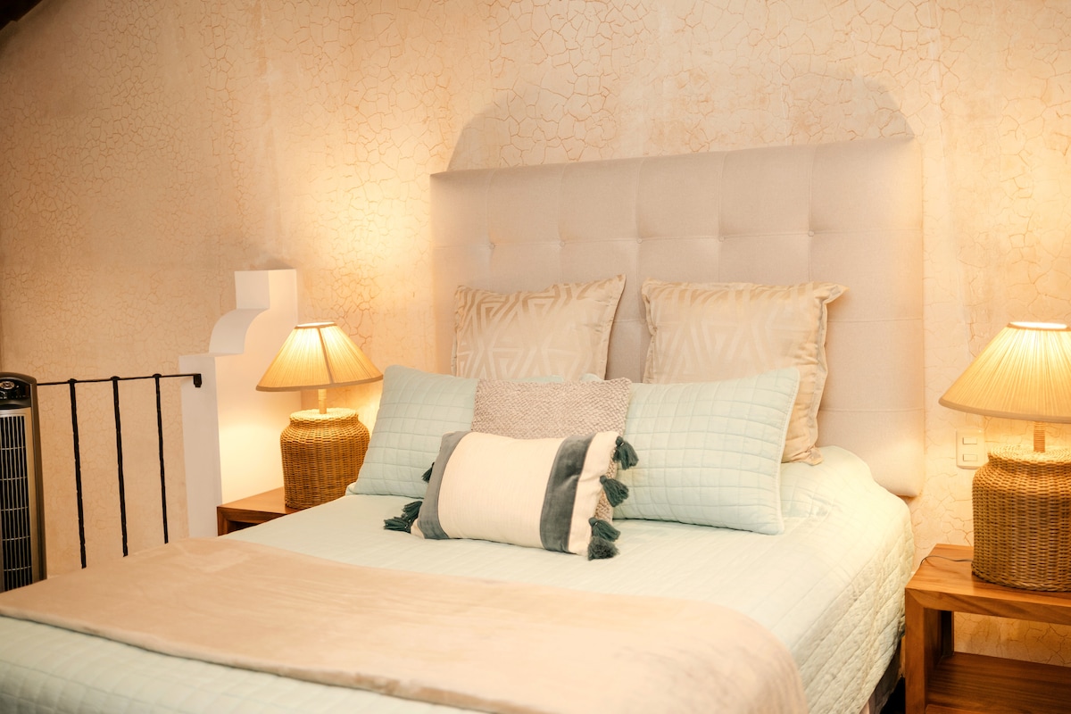 Cozy colonial villa at the entrance of Antigua. Perfectly located to enjoy the vibrancy of the city and then relax and unwind. Ideal for families with two small children or couples. Ground Floor: Cozy living room (sofa bed!), lush garden views, fully equipped kitchen, & intimate dining for 4. Work al fresco under the shade in the garden. Upper Floor: Queen-size bed with ample storage, smart TV entertainment, & a sparkling bathroom (powerful shower!), stocked with essentials.