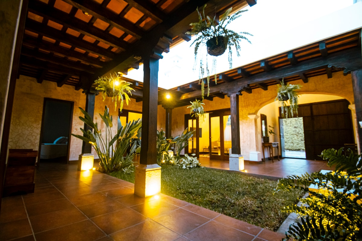 La villa tipo loft tiene su propio estilo colonial, disfruta una relajante experiencia en pareja amigos o trabajo, rodeada de fuentes de agua piscina climatizada, tranquilos jardines, vistas a volcanes, senderos, pérgolas con cava fogatas y parrilla, shuttle a lugares céntricos dentro del casco de Antigua, a solo 500 metros de entrada a la ciudad colonial a 1 kilómetro de Central Park, un exclusivo condominio con vigilancia 24/7 villa completamente equipada, sanitizada en cada cambio de huésped.