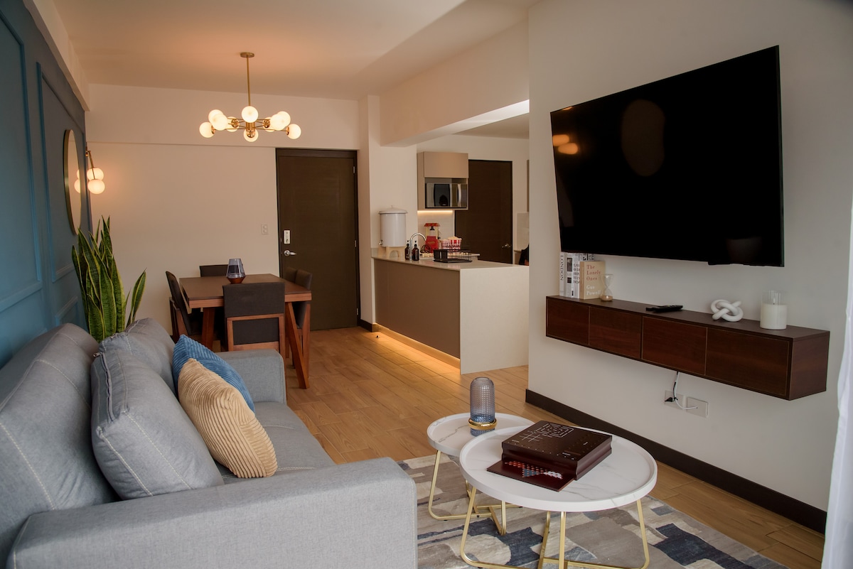 Moderno y lujoso apartamento en zona exclusiva, con impresionantes vistas desde nuestra sala y la terraza del edificio. Cuenta con wifi, cerradura autónoma digital y una cocina bien equipada si le gusta cocinar. Queremos informarle que la siguiente fase del edificio está en construcción 🚧 lo que en ocasiones genera ruido que no podemos evitar, pero nos hemos preparado y dejamos dos pares de tapones de oídos sellados en el botiquín para su comodidad.