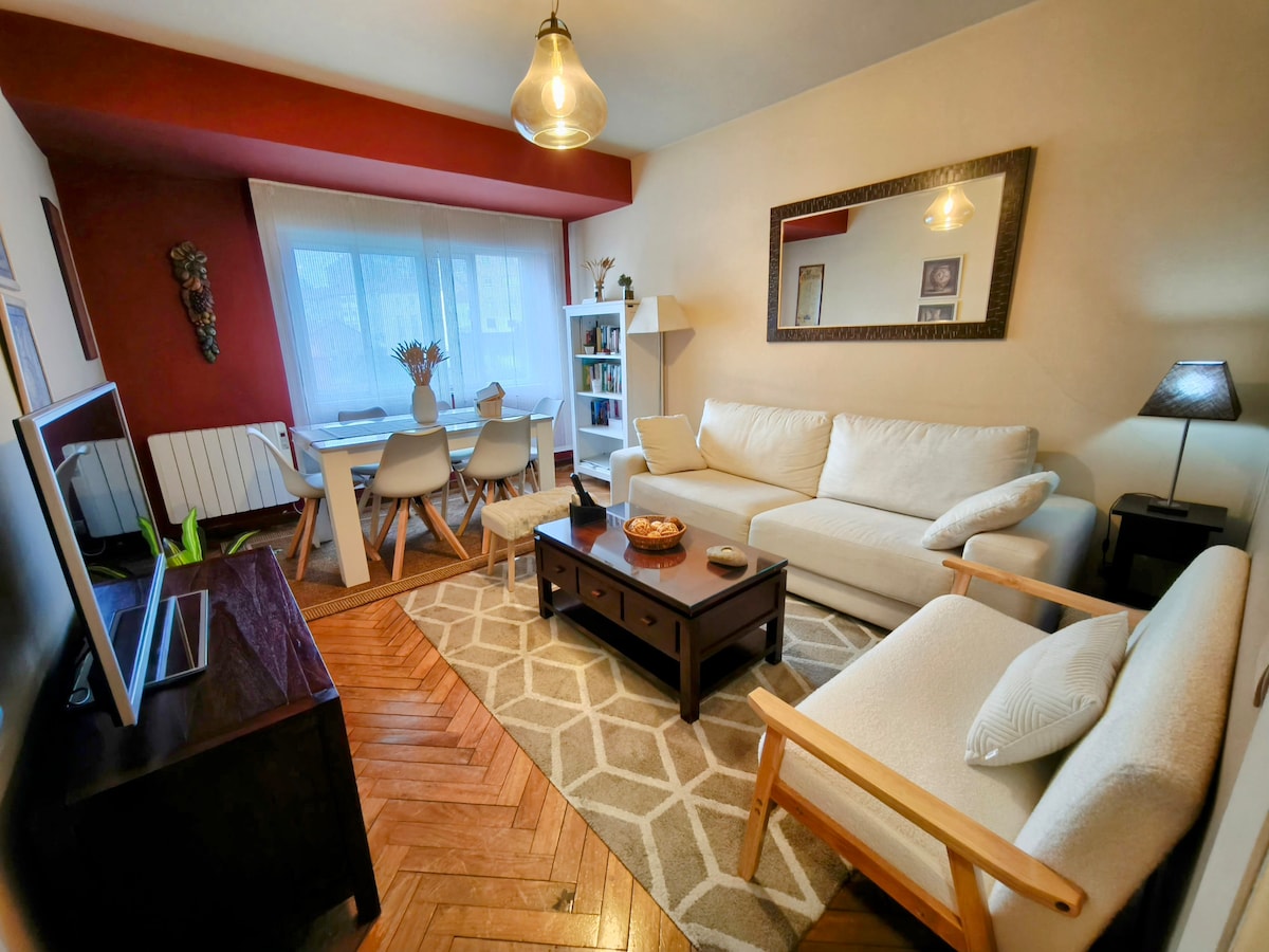 Beautiful 105m2 apartment designed to make your stay in Compostela unique. "Alén do Camiño" is located in one of the quietest, safest, and most central areas of the city: next to the Intermodal Station, train-bus-taxi (Madrid 3 hours away). Near the Galician Parliament, you can enjoy the historic center and the Cathedral in a 10-minute walk. It offers free parking, and within its 50m2 area you will find a pharmacy, hospitals, a playground, and various restaurants.