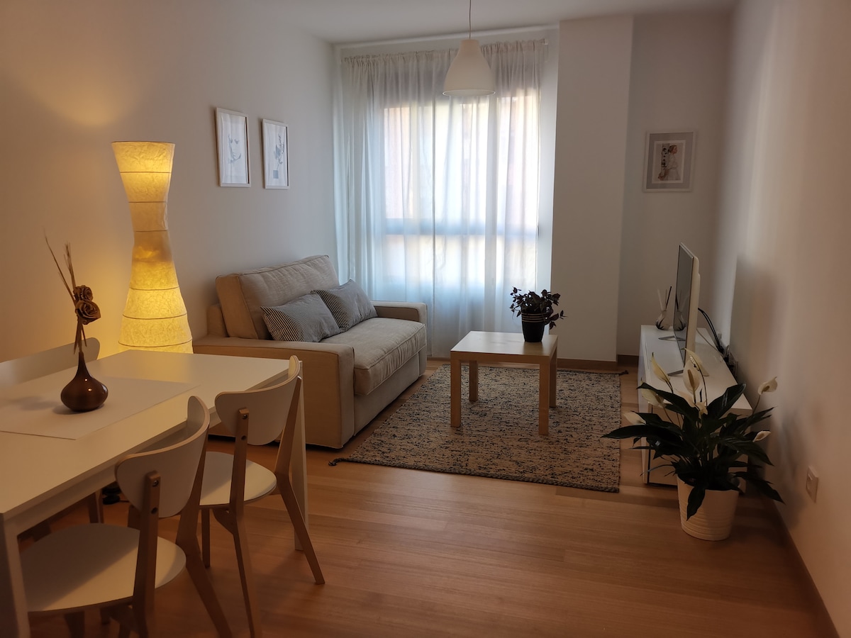 Luxury apartment with double bedroom, separate kitchen, living-dining room, bathroom with bathtub, balcony overlooking green area and covered garage space. Discover the charm of Santiago de Compostela and rest comfortably in our fully equipped apartment, located less than 15 minutes walk from the city center. The apartment has high-quality furniture and appliances and is located next to the bus and train station, in a quiet, green and central area.