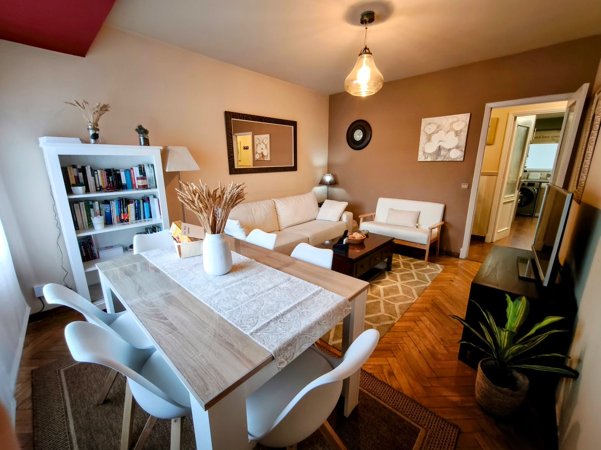 Beautiful 105m2 apartment designed to make your stay in Compostela unique. "Alén do Camiño" is located in one of the quietest, safest, and most central areas of the city: next to the Intermodal Station, train-bus-taxi (Madrid 3 hours away). Near the Galician Parliament, you can enjoy the historic center and the Cathedral in a 10-minute walk. It offers free parking, and within its 50m2 area you will find a pharmacy, hospitals, a playground, and various restaurants.