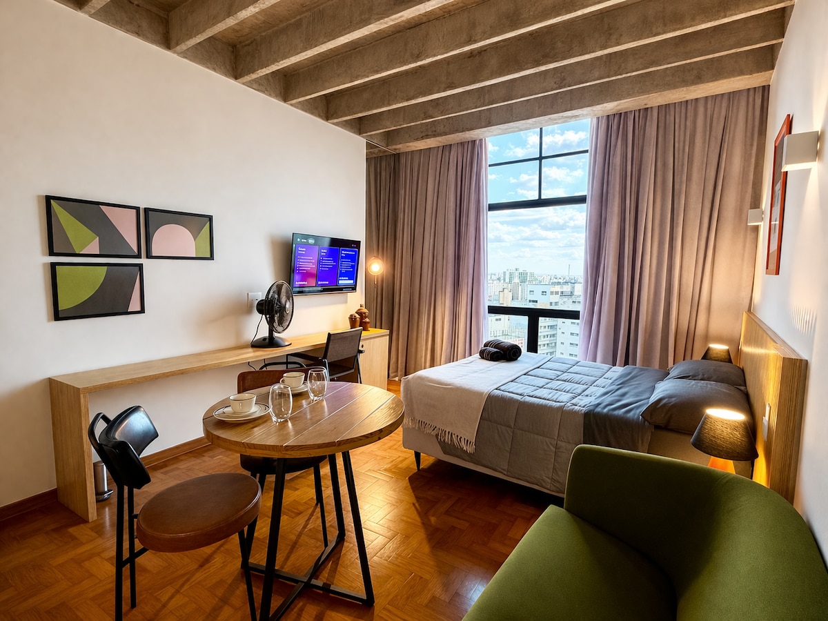 O studio fica no 31º andar do edifício mais alto do centro, com um design moderno e acolhedor, além de uma vista impressionante da cidade. Da janela, é possível admirar o Vale do Anhangabaú, Centro Histórico, as antenas da Av. Paulista: uma das paisagens mais belas de SP. É o prédio onde fica o SampaSky e é possível caminhar para as principais atrações do centro. Conta com ar condicionado, TV de 55'' com apps, cozinha equipada com utensílios básicos, cooktop (1 boca), microondas e frigobar.