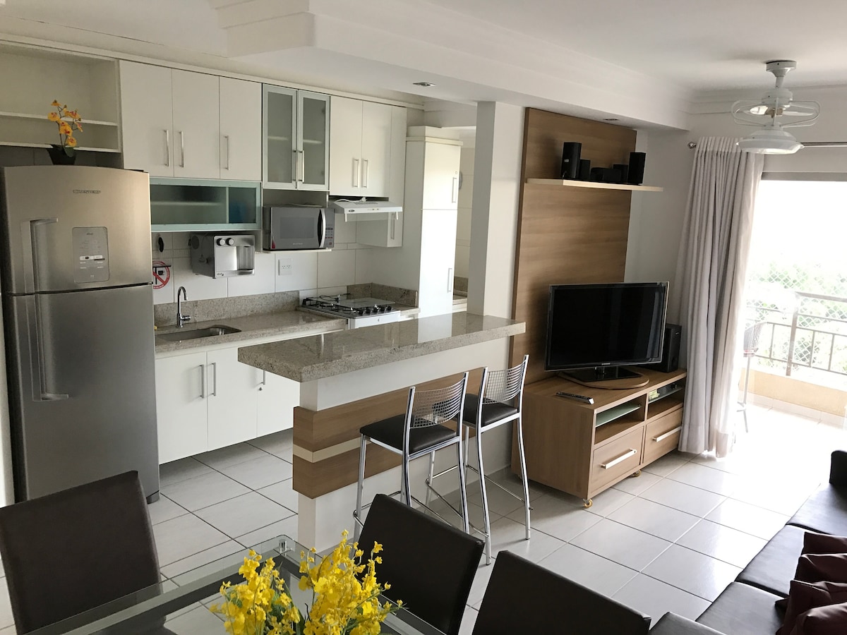 Sobre este espaço: O apartamento está localizado no Condomínio Parque das Águas Quentes. O imóvel tem 80 metros quadrados, 2 quartos (1 suíte com ar condicionado), 2 banheiros, sala com TV, cozinha completa com micro-ondas, fogão, geladeira e utensílios novos, etc. Apartamento comporta até 5 pessoas (criança ate 5 anos). Super confortável e bem amplo! Horário de funcionamento das piscinas: 06:00 às 24:00.