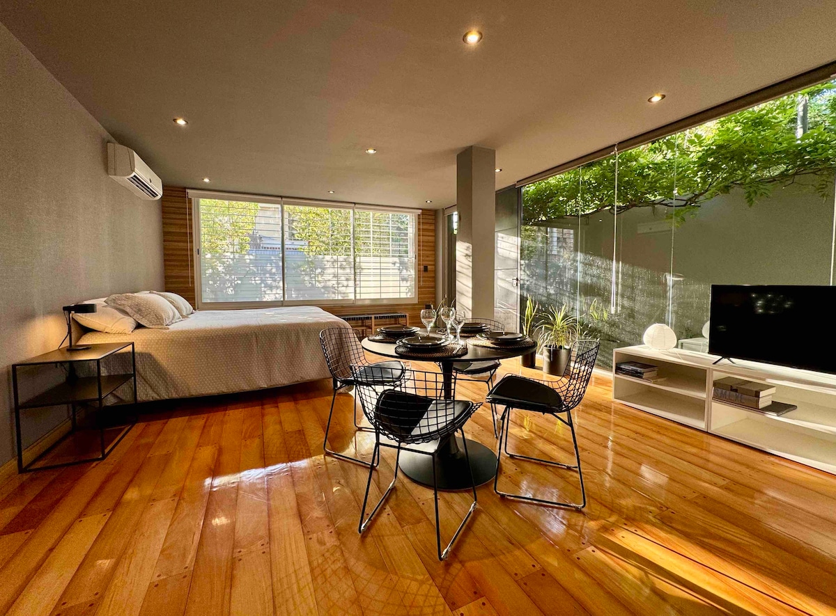 A unique place. A space to fully experience. 13 km from the city of Mendoza and within the "Wine Roads" circuit. With a private exit, exclusive covered garage, excellent Wi-Fi, a queen-size bed, en suite bathroom, TV, refrigerator, electric oven, microwave, electric kettle, bed and bath linens, and pool towels. We also include a split-screen TV and a safe. We continue to add comfort and tranquility to make your stay in our space unforgettable.