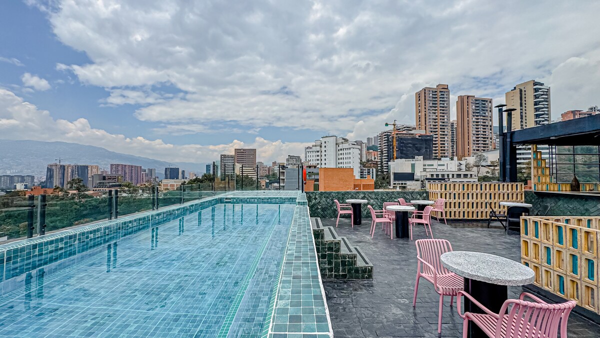 Vive una estadía exclusiva en El Poblado, a media cuadra del parque y a solo 2 minutos de Provenza, rodeado de la mejor gastronomía y vida nocturna de Medellín. Disfruta un espacio amplio, moderno y sofisticado, donde el protagonista es su jacuzzi privado con vista a la ciudad, perfecto para relajarte con total privacidad. Además, podrás disfrutar de la piscina, terraza al aire libre con vista 360° y un desayuno delicioso incluido cada mañana. No lo pienses mas y nos vemos pronto en Medellín!