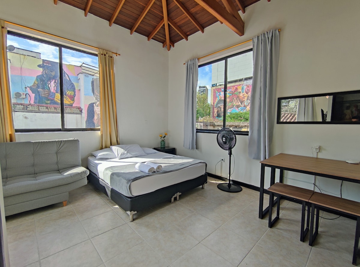 Stop looking, here you have all you need: -Fully renovated industrial loft design -High-speed Internet, ideal for remote work -Ergonomic desk chair -A/C -Unbeatable location in the lower area of Poblado, you can do everything by walk -Metro station, supermarkets, pharmacy, coworking, cafes and restaurants within walking distance -4 blocks from where city and Guatape tours departure -Close to Provenza and Lleras (you can also go by walk) -Washing machine -Well-equipped kitchen -24/7 security