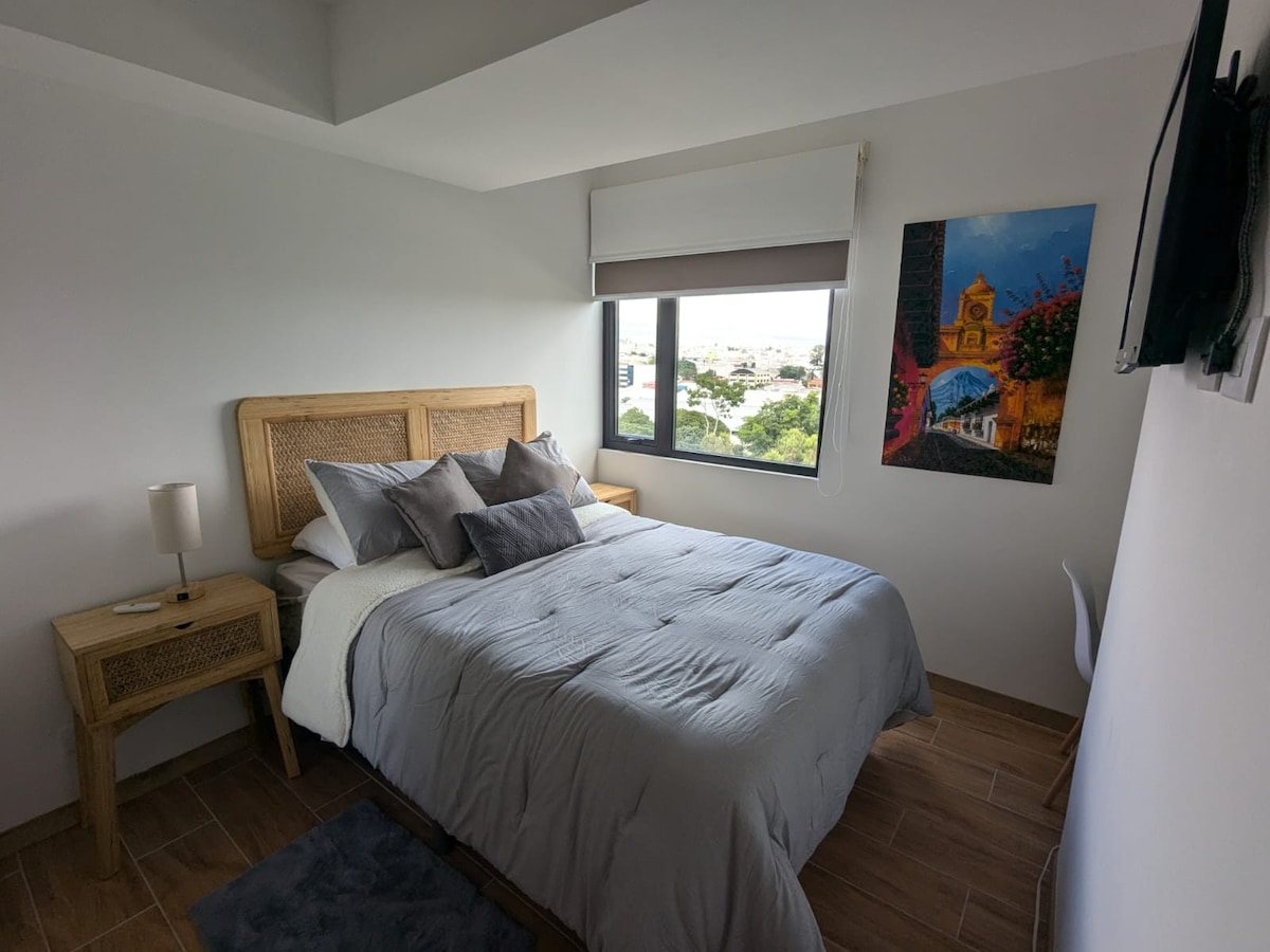 Disfruta de este encantador apartamento pequeño tipo estudio con aire acondicionado portatil de ventana y vistas impresionantes al volcán de Agua desde el balcón. Ubicado estratégicamente en el corazón del distrito comercial y empresarial de Guatemala, a solo 15 minutos del aeropuerto. Este apartamento te ofrece una experiencia única, rodeado de una amplia variedad de restaurantes, bares y centros comerciales para que disfrutes al máximo tu estadía.