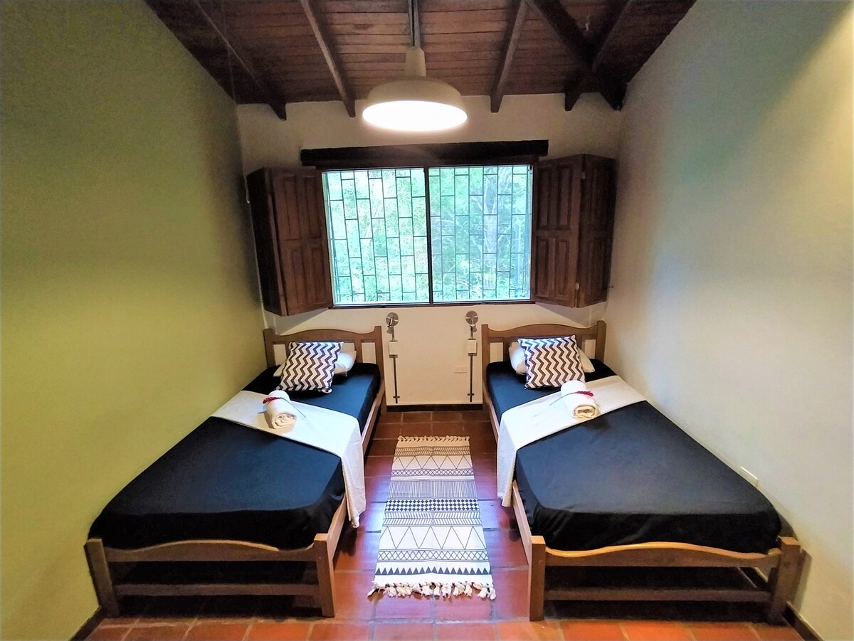 Surrounded by a stunning jungle garden is our traditional-styled villa. Our private quadruple room has two double beds, perfect for friends traveling together. The house is separate from the hotel but just next to it, in three minutes you are by our pool! This room has fans. Escape the ordinary without breaking the bank at our Traditional Colombian house. Affordable, laid-back, and surrounded by nature – Your jungle adventure starts here.