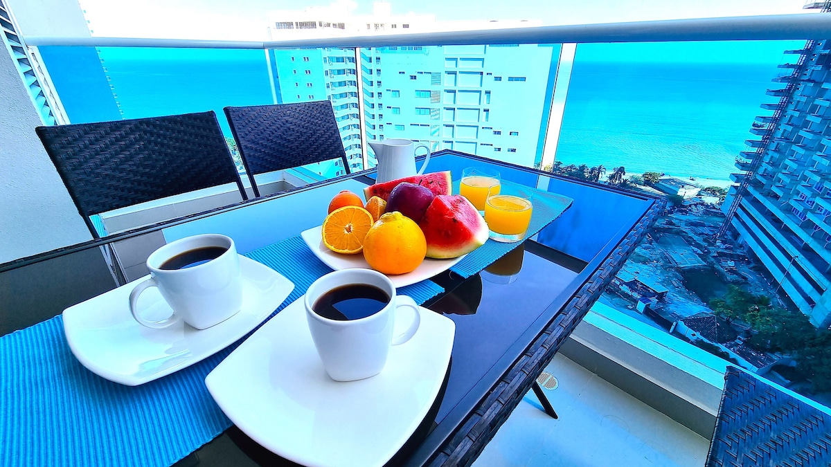 Apartamento moderno y tranquilo con vista al Mar Caribe, 1 habitación con cama doble, AA, TV Smart y baño con ducha de agua caliente. Sofa cama doble con vista al balcón, con AA, TV Smart y segundo baño con ducha. Internet fibra óptica alta velocidad, sala, comedor, escritorio, cocina, lavadora, parqueadero cubierto, ascensores, vigilancia 24 horas. Salida directa a la playa. A pie de gran variedad de excelentes restaurantes, supermercados, almacenes, agencias de viajes, bancos y vida nocturna.