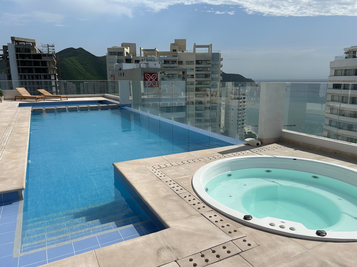 Modern ocean-front apartment perfect for families or couples. Features two comfortable beds, desk, smart TV, high-speed Wi-Fi, air conditioning, hot water, private bathroom, washing machine, and full kitchen. Building amenities include a rooftop infinity pool and jacuzzi, sauna, Turkish bath, spa, terrace, and bar. Prime location: steps from the beach, next to Carulla supermarket, and close to the Historic Center, Marina, and Club Santa Marta. Book now and experience Santa Marta in style!