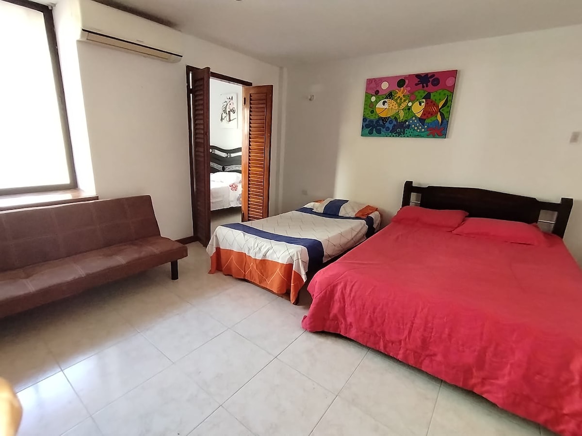 Relájate con toda la familia en este tranquilo lugar para quedarse. Capacidad para 7 personas comodamente en nuestro apartamento independiente donde tendras cocina privada, baño privado, 2 camas dobles y 3 camas sencillas, entrada independiente, aire acondicionado y nevera para que disfrutes de Santa Marta en todo su esplendor, a tan solo 250 m de la mejor playa de Santa Marta, el Rodadero donde podras disfrutar de la costa caribe Colombiana salida independiente a la calle