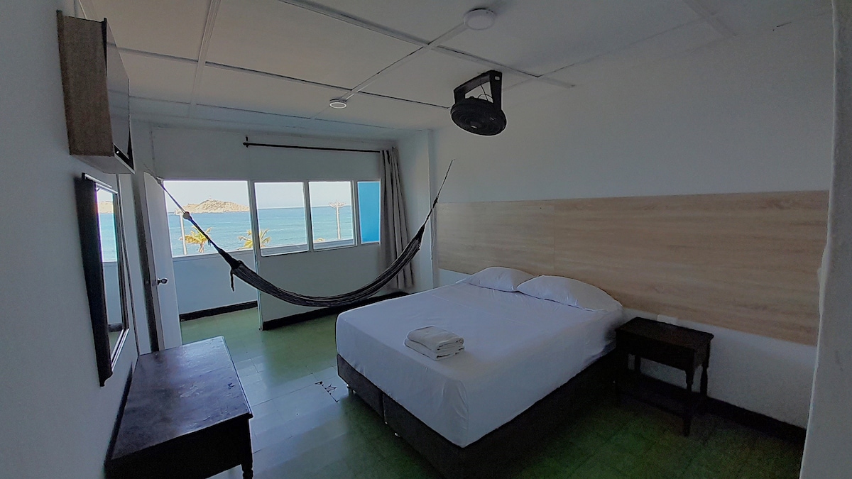 ¡Un espacio especial con alma caribeña! Nuestra habitación doble con aire acondicionado ofrece el equilibrio perfecto entre confort y un diseño artesanal único. Rodeado de colores vibrantes y detalles auténticos, relájate en la terraza principal mientras disfrutas de atardeceres espectaculares. Cada espacio de nuestro hotel es diferente, pensado para desconectarte y llenarte de inspiración. A menos de 5 minutos caminando de la playa de Taganga ¡Te esperamos!