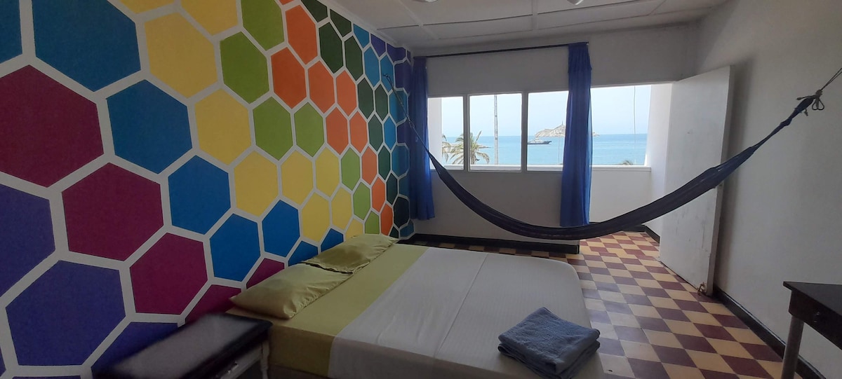 ¡Un espacio especial con alma caribeña! Nuestra habitación doble con aire acondicionado ofrece el equilibrio perfecto entre confort y un diseño artesanal único. Rodeado de colores vibrantes y detalles auténticos, relájate en la terraza principal mientras disfrutas de atardeceres espectaculares. Cada espacio de nuestro hotel es diferente, pensado para desconectarte y llenarte de inspiración. A menos de 5 minutos caminando de la playa de Taganga ¡Te esperamos!