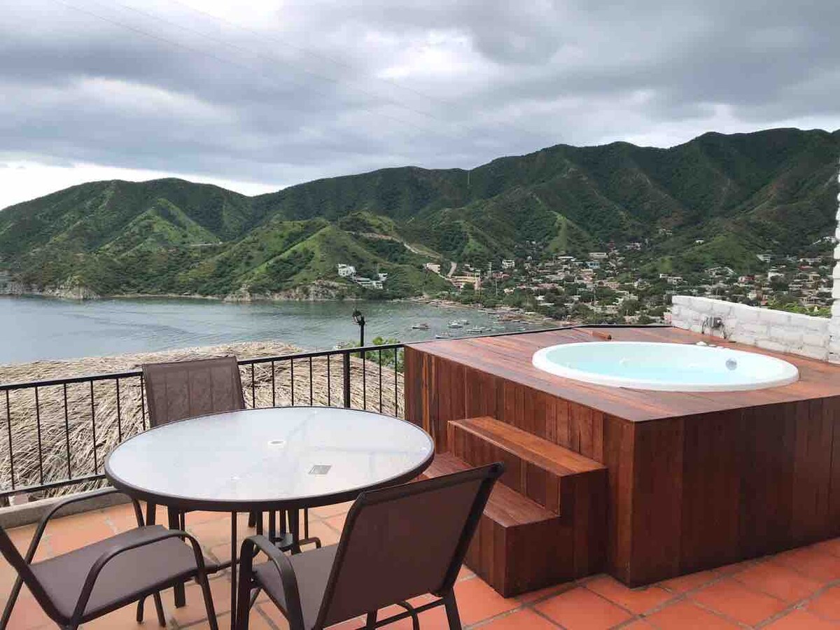 Cómoda, amplia y confortable cabaña tipo loft, cama doble en el mejor sector de Taganga, Jacuzzi y mirador privado (azotea), uso exclusivo del cliente, baño, sistema de wifi y Netflix, aire acondicionado, cocina integral con utensilios para cocinar y nevera, debes subir escaleras, a solo 200 metros de la Bahía de Taganga, espectacular jacuzzi panorámico, excelente vista al la Bahía y al pueblo de Taganga.