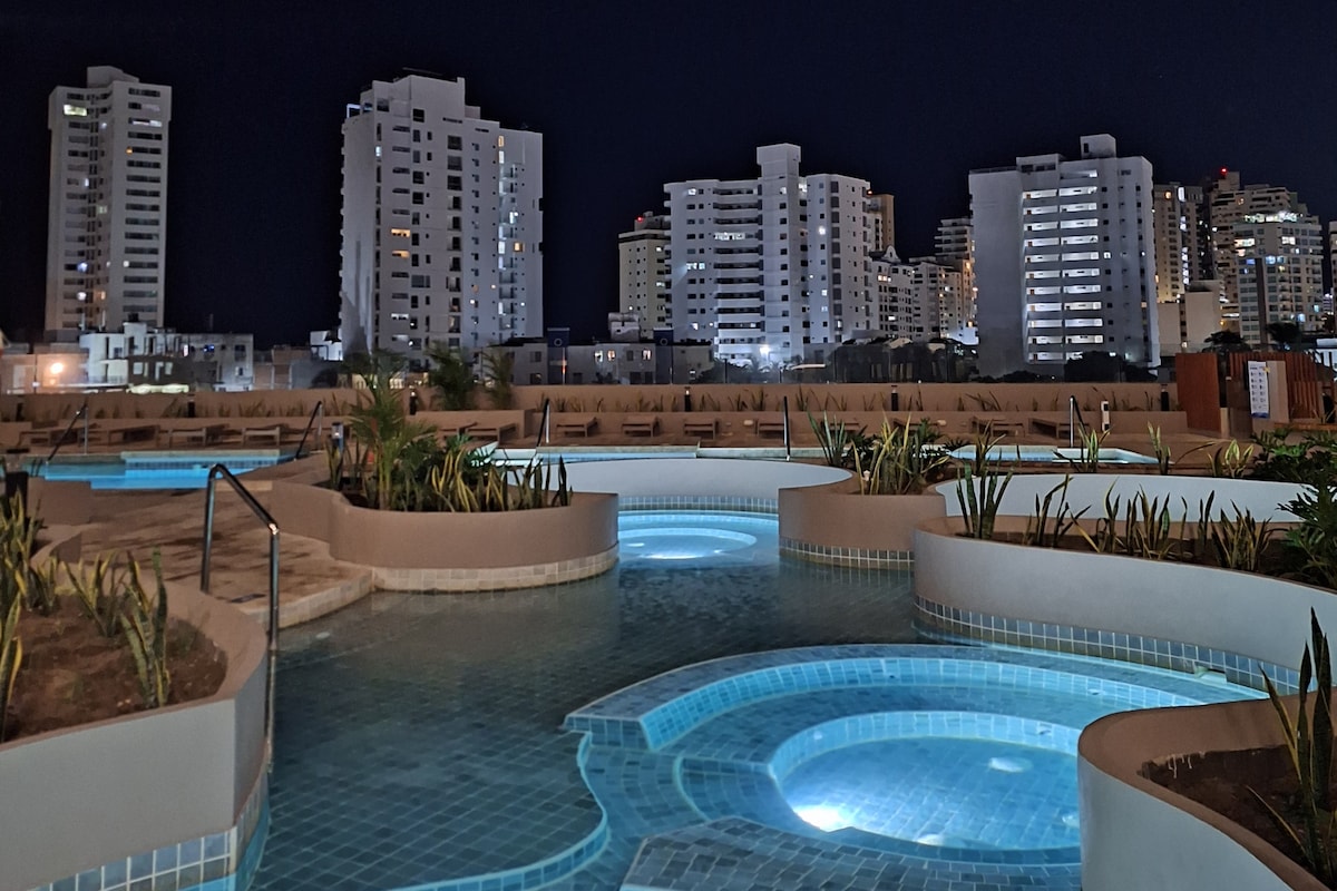 Escape to a luxury suite in Santa Marta, just steps away from beautiful Salguero and Rodadero beach. Perfect for couples, or families that comfortably accommodates 1 to 4 guests. Private security 24/7, fully equipped kitchen, black out, keyless entry, air conditioning, private balcony with an amazing views , 58” Smart TV, one extra double bed and a comfortable sofa bed, 2 swimming pools, a gym, ping pong and billiard table, coworking area and close to malls and many restaurants!
