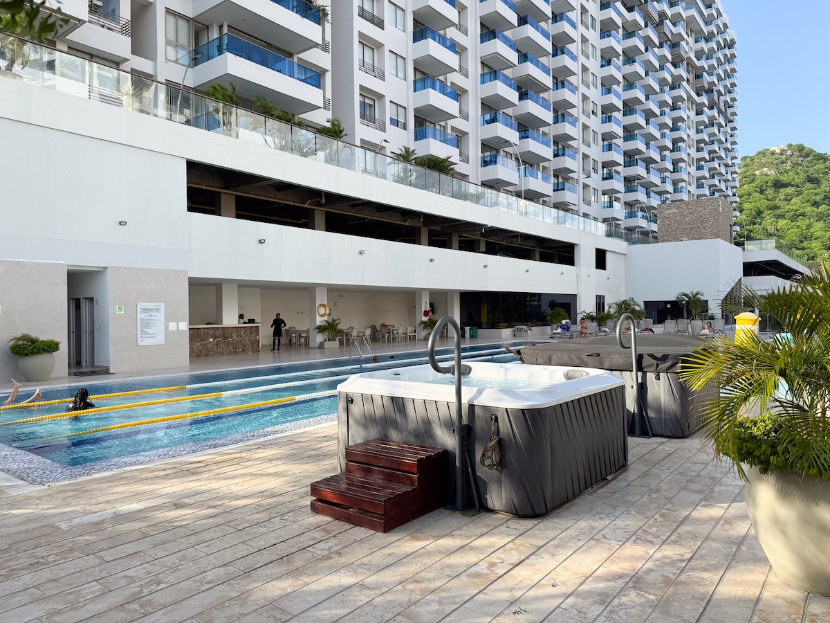 Confortable aparta suite para 6 personas en las Playas del Rodadero. Balcón, 2 baños, sala comedor, cocina, parqueadero, piscina, yacusi, sauna y turco. Ubicado muy cerca de centros comerciales, supermercados, la mejor oferta gastronómica, artesanal y una agradable vida nocturna. A solo 10 minutos del centro histórico de la ciudad y de fácil conexión que le permitirán visitar las maravillosas playas que circundan la Bahía y la belleza natural de la mítica sierra nevada de Santa Marta.
