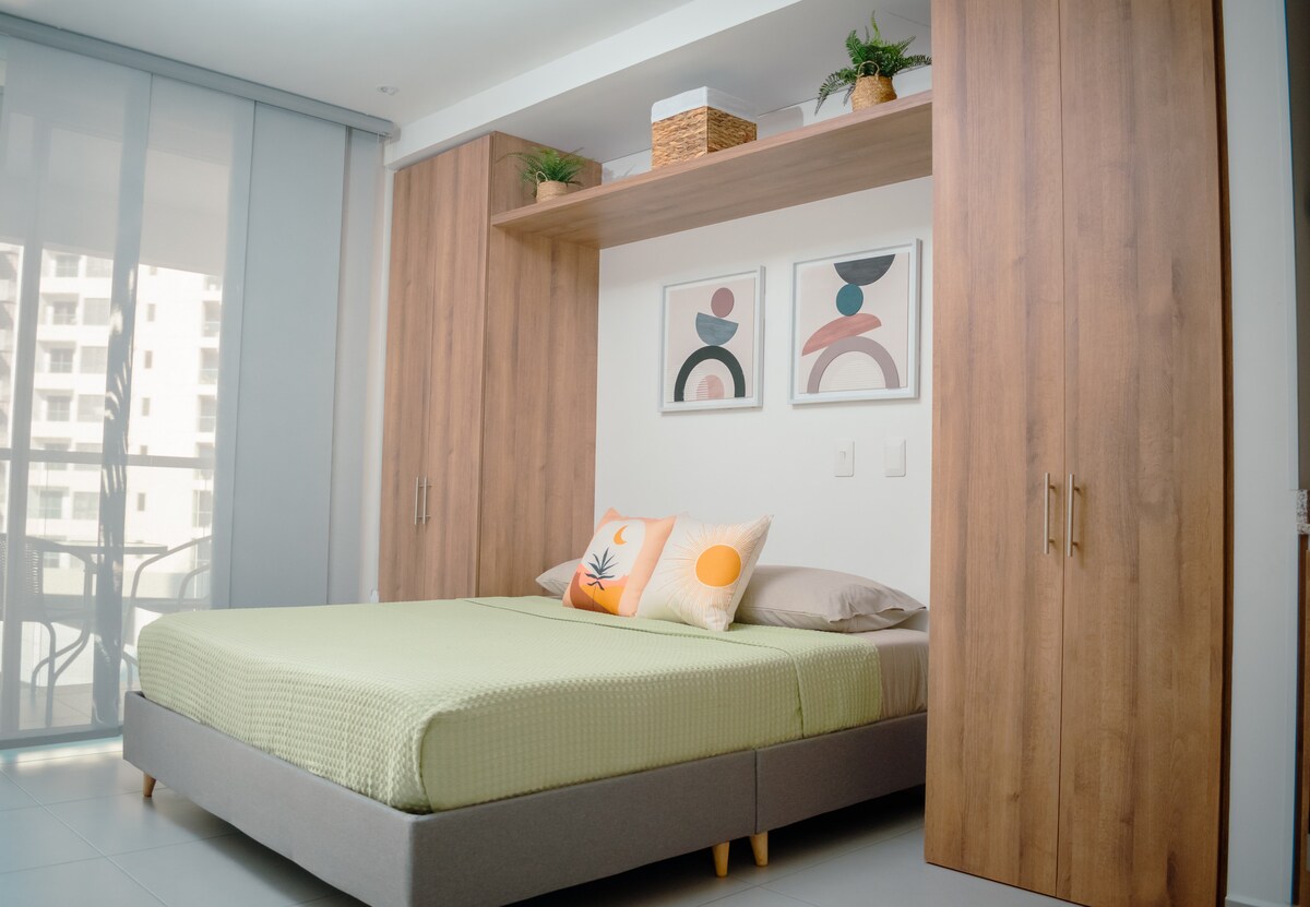 Moderno apartamento tipo loft con vista al mar a solo 100 metros de la playa en el Rodadero. Perfecto para 1-3 huéspedes con cama amplia, sofacama, cocina equipada, espacio dedicado para trabajar y baño de diseño moderno. Incluye increíbles amenidades: piscinas para adultos y niños, gimnasio completo, sauna y zona de BBQ. WiFi de alta velocidad incluido. Ubicación privilegiada cerca de restaurantes, zona comercial y atracciones turísticas. ¡Tu escape perfecto en el Caribe colombiano!