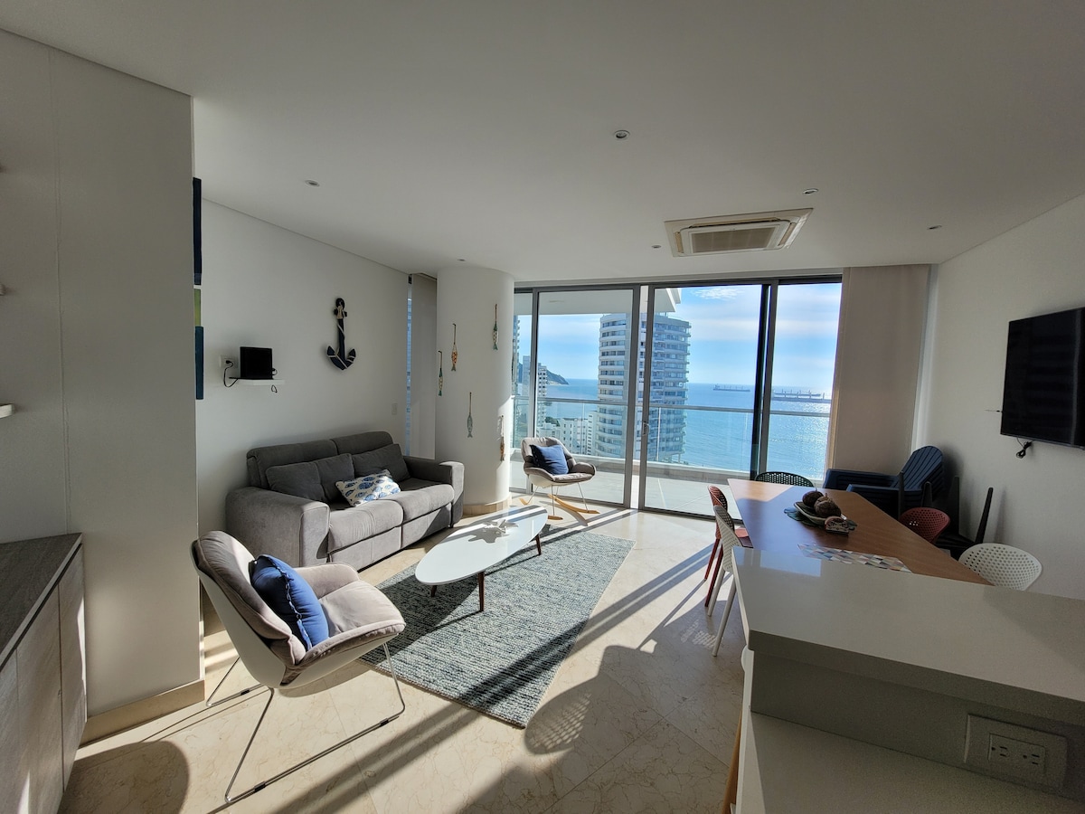 Espectacular apartamento en planta 6 con vista al mar. Sus 73 mts cuadrados están decorados en un estilo moderno y acogedor. Situado delante de la Marina Internacional y a 3 minutos caminando del parque de los novios. Cuenta con 2 balcones para disfrutar del los increíbles atardeceres de Santa Marta, nuestros huéspedes tienen acceso a las lujosas instalaciones del hotel Marriot, sus dos piscinas con vistas al mar, restaurante, Bar y servicio de masajes. cuenta con dos ascensores