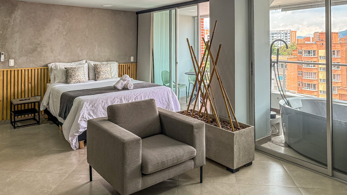 Indulge in Medellín from this exclusive studio with a private skyline jacuzzi, king bed, A/C, and breathtaking city views — the ultimate retreat for elegance, comfort, and vibrant nightlife. Nestled in El Poblado, steps from Provenza’s restaurants, rooftop bars, cafés, and galleries, with Parque Lleras nightlife minutes away. Enjoy 54" smart TV with Netflix, high-speed Wi-Fi workspace, kitchen, washer/dryer, gym, sauna, pool, and on-site bars, restaurants, and gallery.