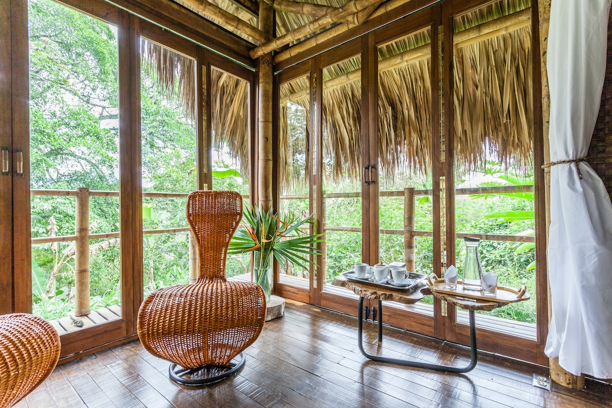 Located in the coffee region, in the Andean mountains of Colombia, South America, a charming cabana made from bamboo, with a great view and a "sendero" or pathway through the bamboo forest which criss-crosses our 5 acre organic farm, leading down to a stream. A place to relax and commune with nature. Please know that the price listed is for one person. Please select the correct number of guests when you request the cabana. The second guest is $20 additional per night. Breakfast is included.