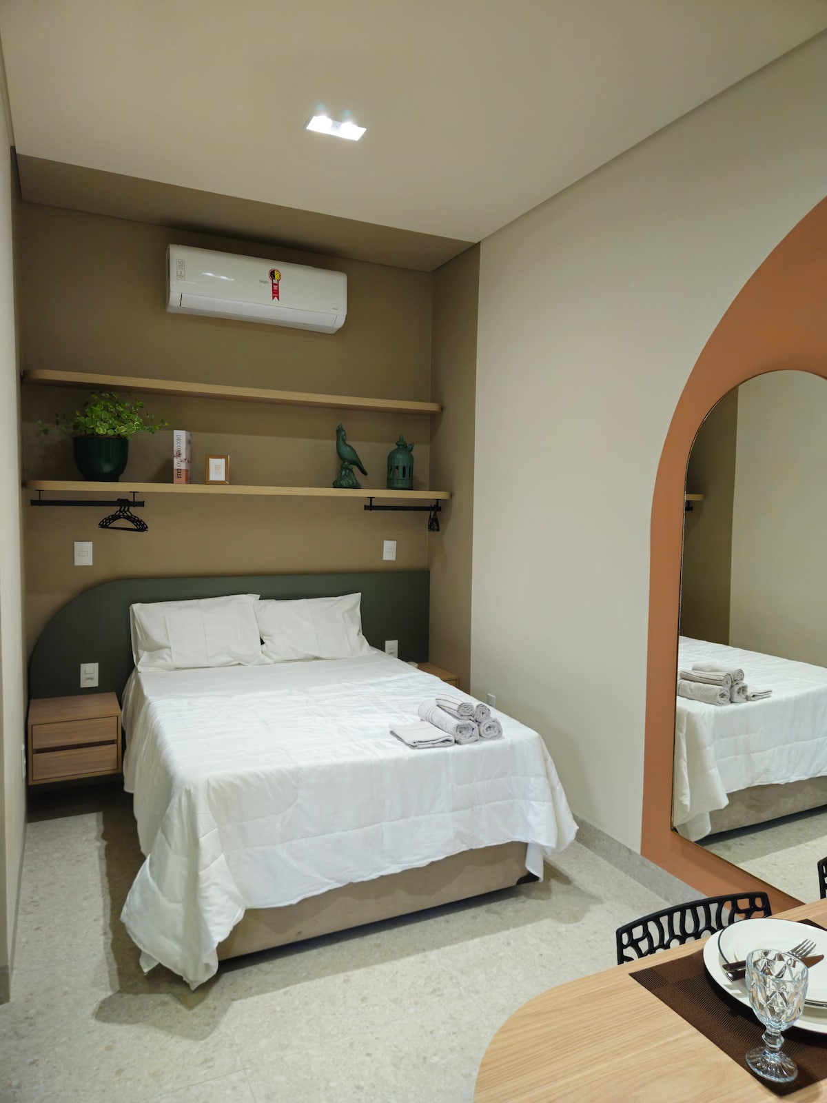 apartamento 1 dormitorio dentro do parque do peao, tem uma cama queen e um sofa cama para mais 2 pessoas, tem microondas, sanduicheira, panela de arroz eletrica e gril. fornecemos toda a roupa de cama, travesseiros, lencois, cobertor. o predio tem 2 piscinas, sendo uma aquecida. tem uma lanchonete que pode tomar o cafe da manha. tem um restaurante que ta para inaugurar.predio novo, terminou no ano de 2019. local e muito tranquilo,fica dentro do parque do peao. a 10 km do hospital do amor.