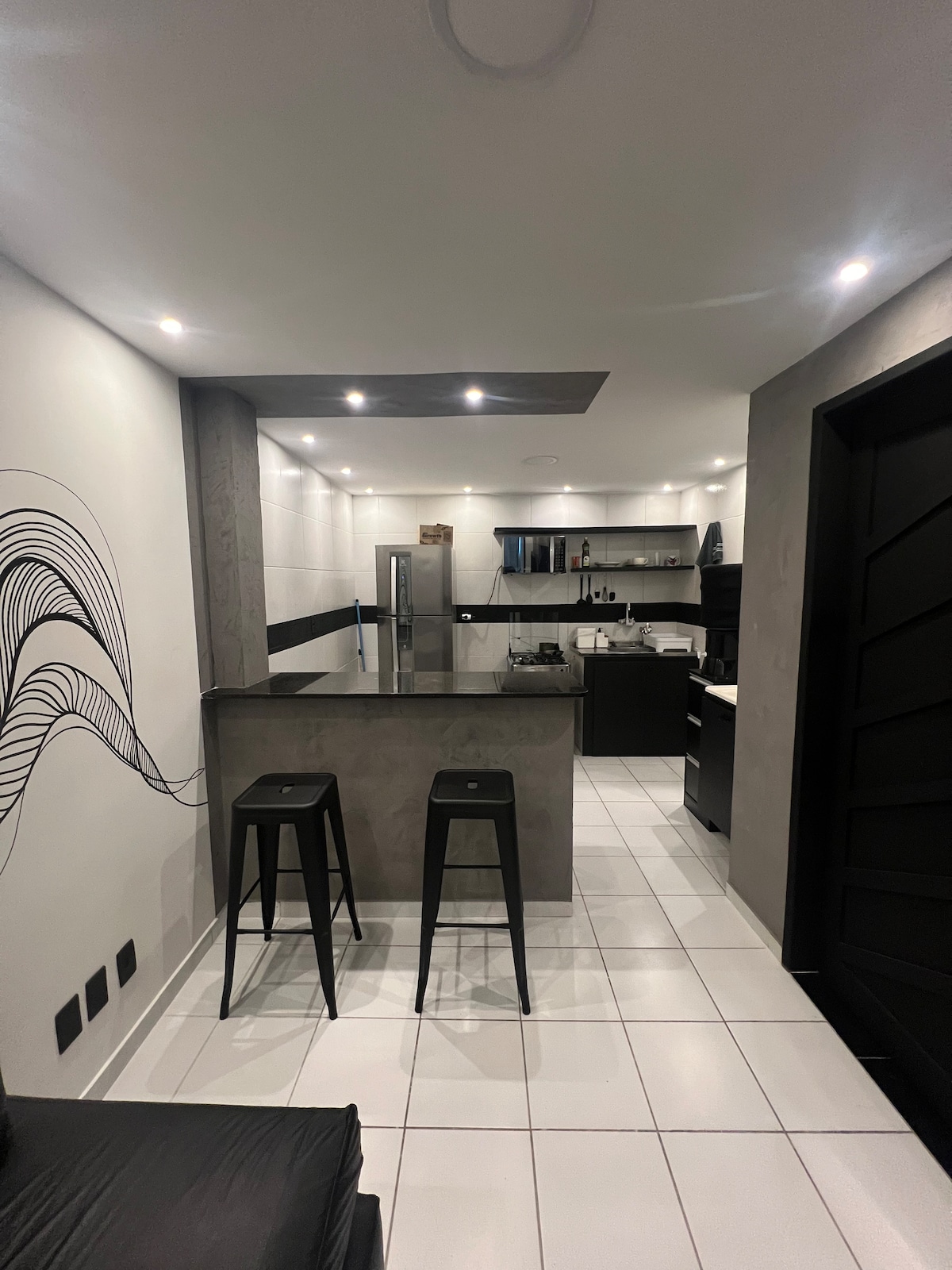 Loft com cozinha, garagem e ar condicionado.