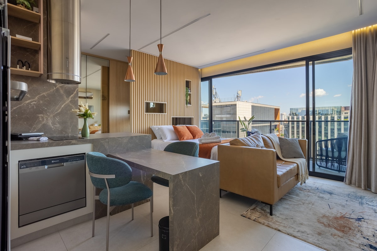 Welcome and make yourselves at home. The apartment is brand new, designed especially for you and has impeccable decor, very practical for everyday life. The view is spectacular! The apartment is on the 28th floor. We are in an excellent location in São Paulo, in the Pinheiros neighborhood, with restaurants, supermarkets and bakeries very close by. It's 40m2 (430 sqft) with 1 bedroom and 1 bathroom. Walking distance from Fradique Coutinho subway station (just 2 blocks).