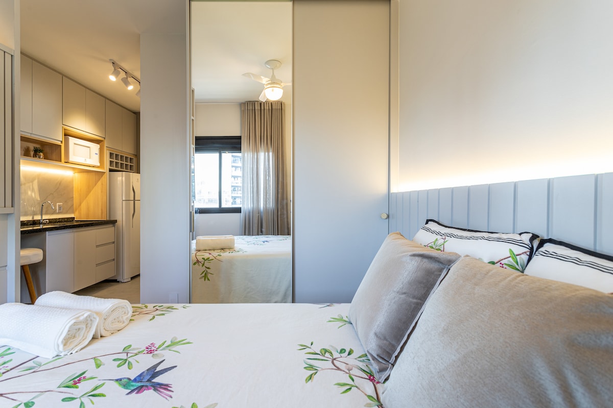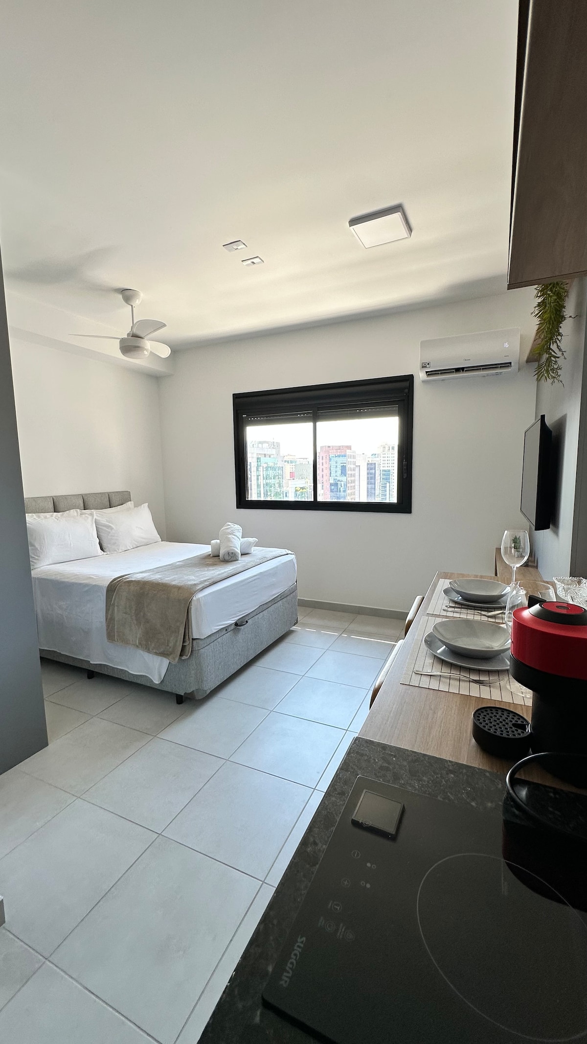 Apto com ar-condicionado, banheiro privativo, TV de tela plana, que pode ser usado para quarto ou para sala, Wi-Fi gratuito, mesa de trabalho, sala e cozinha compacta equipada e uma vaga de estacionamento. O prédio ainda conta com restaurante no piso térreo, academia bem equipada e piscina. Shopping JK Iguatemi esta 100m bem como Parque do Povo O aeroporto mais próximo é o Aeroporto de Congonhas cerca de 6 km. Transporte coletivo, como ônibus e trem que interliga com metrô tudo bem perto.