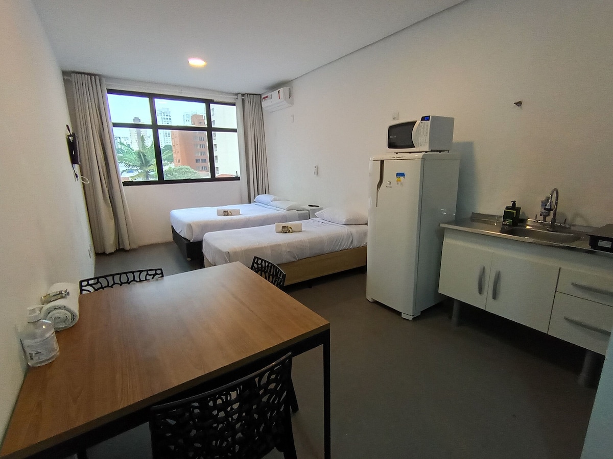 Stúdio moderno e aconchegante, sacada, cozinha compacta, ar-condicionado, Smart TV, além de muitas outras comodidades. localizado a 300 m do metrô Anhangabaú e a 500 m da estação República. Tenha a segurança de um condomínio com portaria 24h. A piscina, a academia e a sala de reuniões estão disponíveis para o hóspede. Self check in ! Os hóspedes recebem a senha (fechadura eletrónica) no dia da chegada.