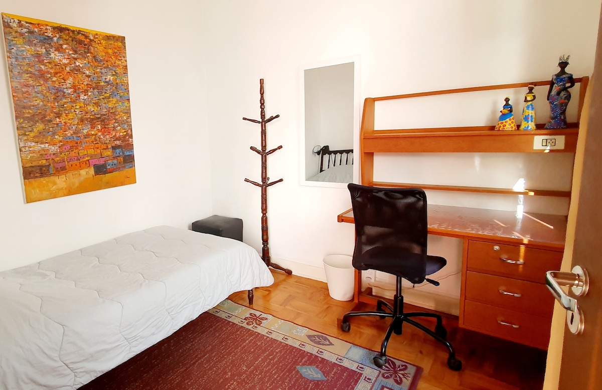 Este espaço fica no térreo de uma casa de 5 andares. Totalmente independente com entrada pela garagem. Ninguém mais mora no andar. O quarto é enorme, acarpetado, iluminado e arejado. Limpo e silencioso. Mesa e cadeira de escritório, cortina blackout. Cama box (casal) e cama extra (viúva). 3 janelões com vista para o jardim. O banheiro tem bidê, box de vidro e aquecimento maravilhoso a gás). Pequena cozinha (só você vai usar) com pia, microondas, fogão duas bocas, frigobar e utensílios básicos.