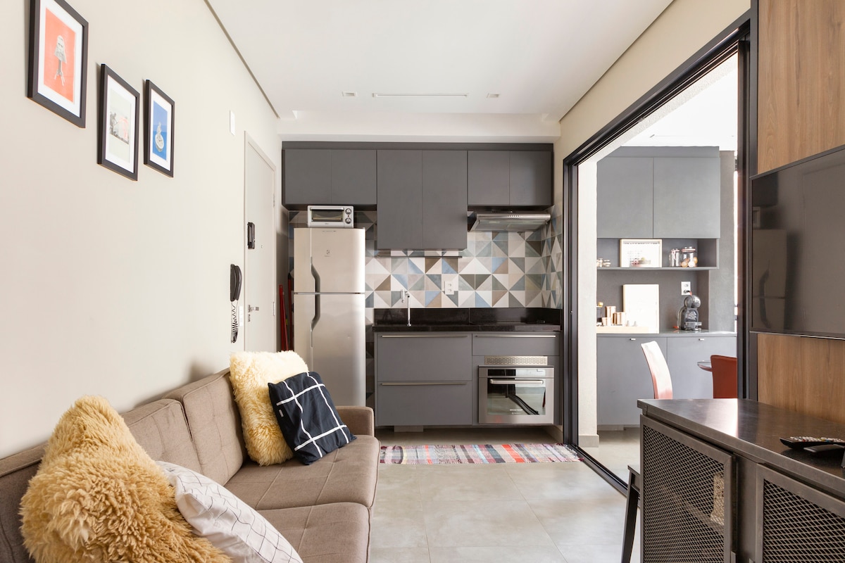 Come live the experience of staying at Senses Z Pinheiros, designed to provide maximum comfort and pleasure during your stay. It´s located on R. Pinheiros, currently one of the most popular streets in SP with restaurants, cafes and shops. Enjoy the district with the bike provided for free by Senses. The building is very safe, it has a gym and a 24h micro market available. The studio has a 50”tv (Netflix), AC, queen size bed, full kitchen... and there is also a small charming green balcony.